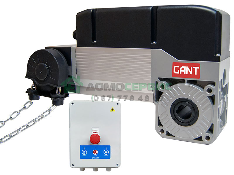 Автоматика для промышленных ворот Gant KGT6.100 предназначена для автоматизации тяжёлых гаражных секционных ворот промышленного класса площадью до 35 м кв и высотой до 5 метров. Устройство представляет собой вальный электропривод 380 В с цепью ручного аварийного управления (8 метров) и блок управления со встроенным приёмником. Мощный двигатель 450 Вт, прочная конструкция исключительно из металлических комплектующих, редуктор с металлическими шестернями в масляной ванне, механические концевики с системой точной регулировки положения – всё это делает привод для промышленных гаражных ворот Gant KGT 6.100 абсолютно надёжным, высокоресурсным и работоспособным при значительных нагрузках.